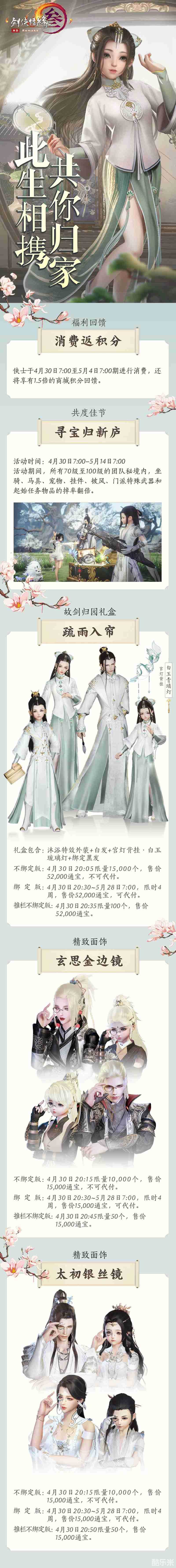 为迎接家园新资料片的抵临,让侠士提前感受到家园生活的美好,在4月30日(即今日)维护后,清致素雅的故剑归园礼盒“疏雨入帘”以及两款时尚精美的全新面部挂件“太初银丝镜”与“玄思金边镜”将上架商城,与侠士一同期待大唐盛世温馨家园!不仅如此,侠士于4月30日7:00至5月4日7:00期间消费还将获得1.5倍积分回馈!并且还有少量不绑定外观将上架剑网3推栏APP,侠士无需登陆游戏也能购买心仪的外观了!