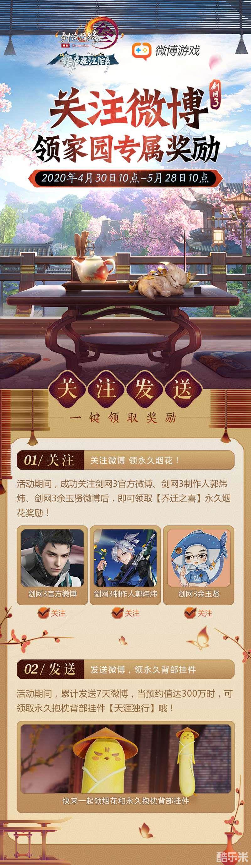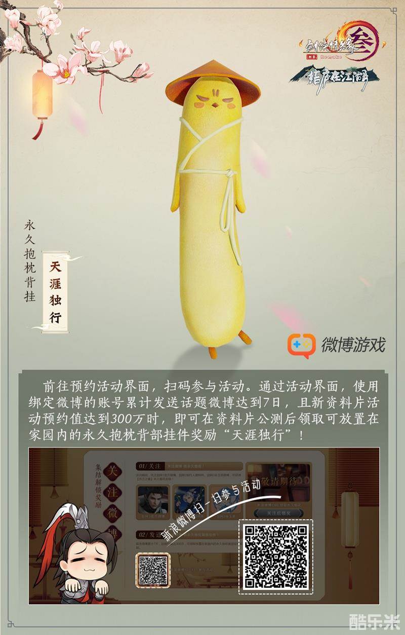 除此之外,《剑网3》在微博也在今日为侠士们准备了诸多家园专属活动。侠士只需关注@剑网3官方微博 @剑网3制作人郭炜炜 @剑网3余玉贤 微博即可获得带成就和世界公告的【乔迁之喜】永久烟花奖励!今日就能领取!而当侠士使用绑定微博的账号发送微博累计7天,且预约值达300万时,即可在资料片公测后领取可放置在家园内的永久抱枕背部挂件奖励“天涯独行”!呆萌可爱的小黄鸡等你来拿!