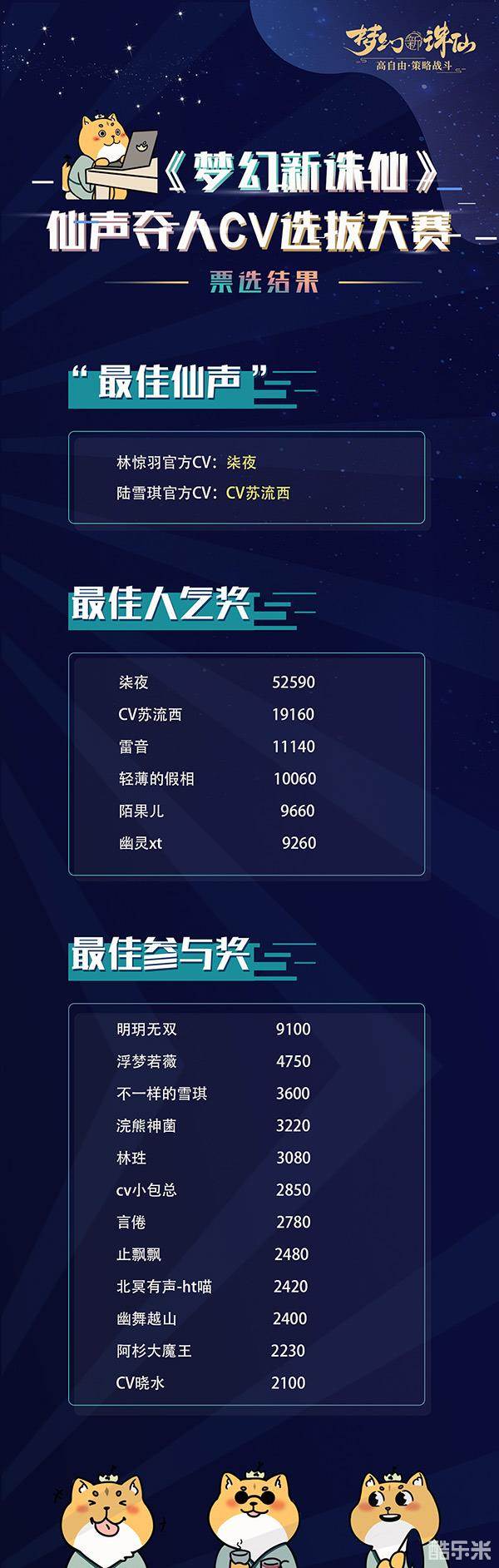 让大家参与到游戏的每一步,本次cv选拔的获胜者全部由大家的投票产生。排名前6位的最佳人气奖获得者会获得精心准备的专业声卡奖励,排名第7至第18位的最佳参与奖获得者会收到官方创作金奖励。不止18名获奖者,所有参赛选手的声音都会变成温暖的回忆,成为《梦幻新诛仙》的一点一滴。