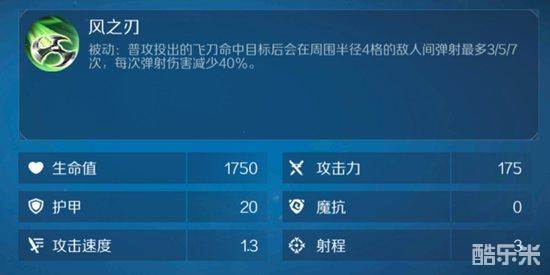 棋子费用为2费,技能叫做风之刃,发射出的飞刀可以对敌人半径所以的角色弹射不同的次数,随着星级的提高弹射的次数也会增加,不过这里大家要注意一点每次弹射的伤害会减少40%哦。现在我们来看看风刃骑士的羁绊。