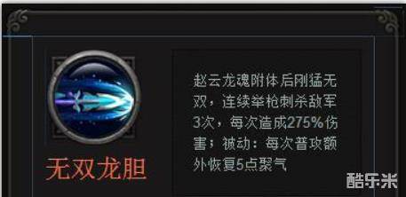 特点:无双龙胆,连续攻击3次,每次275%伤害,此技一出,谁与争锋!被动更是普攻附带5点聚气,这使得赵云成为最易集气的可怕存在,赵云的本命技能绝对是最强之一。蓝色3星概率恢复10点聚气,目前没有用过,不知效果如何,但是已然很强横了。羁绊中规中矩的兵力与攻击,天赋加成一水的攻击暴击,独一的保命技能制造200%攻击力的护盾给自己,神将技能龙胆,相当于死亡前5S的无敌状态,当然可能被治愈,战斗触发一次。伴随着触发150%无视防御的真实伤害,使得赵云成为最具锋芒的前排!