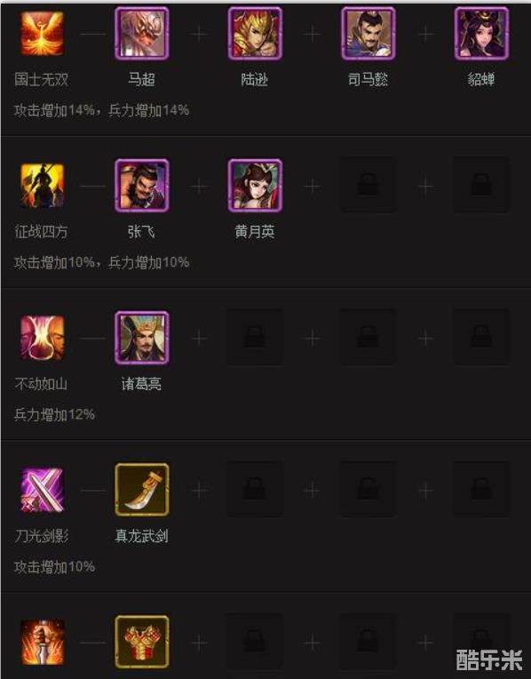 说明:所有羁绊组合需要在武将全部凑齐后方能产生羁绊效果。