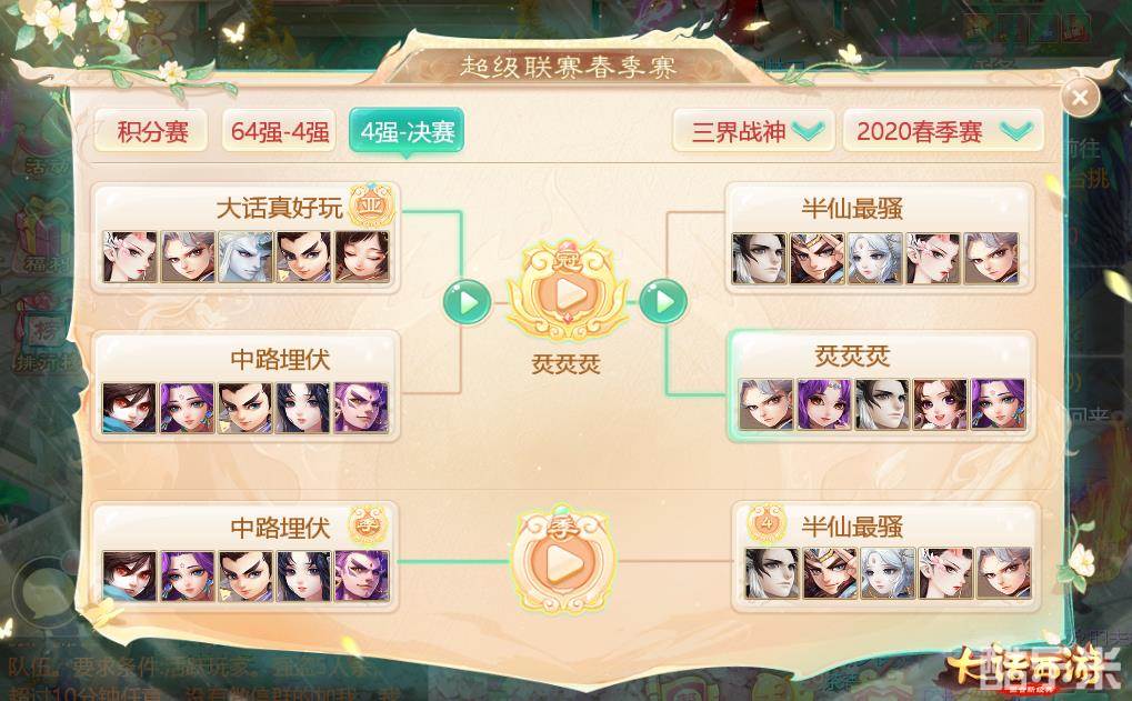 以上就是本届超级联赛春季赛的全部赛果,具体对阵情况玩家可前往大赛专题页面(https://dhxy.163.com/2020/cjls/)中的“赛程积分榜”栏目中查看,或是在游戏中进入超级联赛春季赛板块,选择“4强-决赛”,就能查看相关组别的冠亚军名次,还可以对精彩比赛视频进行回看!让我们再次祝贺所有获得冠军的强力战队,你们不仅用出色的表现证明了自我实力,更为大话兄弟们带来了一场场精彩十足的比武,让所有关注此次赛事的玩家们都体验到了大话手游PK的畅快淋漓!
