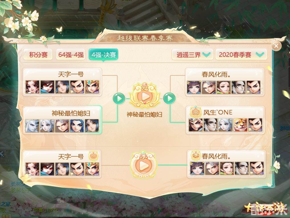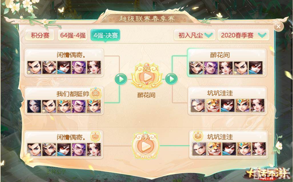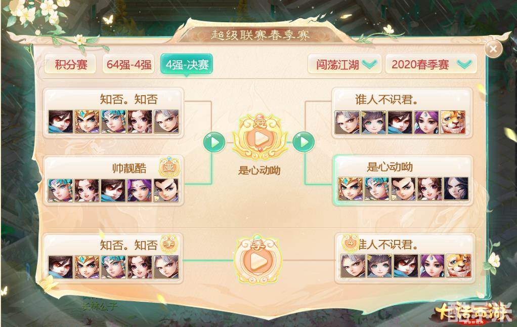 最后编辑于5年前风云际会,一战成名!上周末,万众瞩目的《大话西游》手游2020年超级联赛春季赛冠亚军决赛已顺利举行,来自各个服务器的PK爱好者们共聚一堂,拿出自己的实力一搏高下。在一番激烈的战斗之后,各个分组的冠亚季军均已出炉。让我们共同祝贺首个赛季夺得桂冠的这些武林高手们,他们凭借自己的努力一战成名,夺得了三界之中至高无上的荣耀!