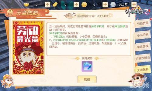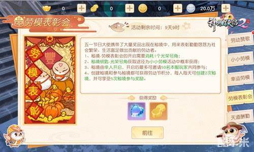 最后编辑于5年前五一“劳动节”即将到来,今年的小长假似乎比以往更久一些,足有五天。面对这突然“加倍”的假期,大侠们有何打算?看看自5月1日起,《神雕侠侣2》为各位准备的丰富活动吧。即便足不出户,也能将有趣假期生活安排上!