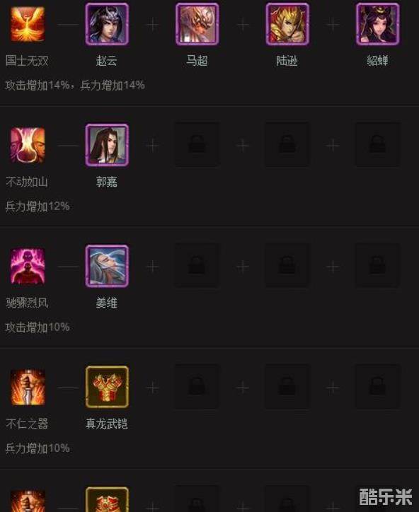 说明:所有羁绊组合需要在武将全部凑齐后方能产生羁绊效果。