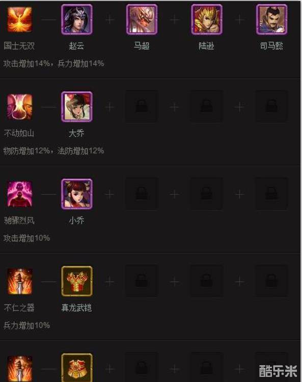 说明:所有羁绊组合需要在武将全部凑齐后方能产生羁绊效果。