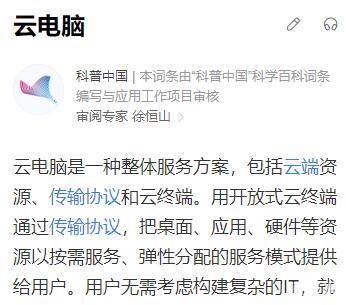 通过百度百科来了解,我们知道云电脑是一种整体服务方案,包括云端资源、传输协议和云终端。其实综合的内容核心点还是云终端,云电脑就是云终端服务器,大量的游戏变成了云游戏实现了云端资源的利用,使用网络进行传输是传输协议并且实现技术上的渲染。