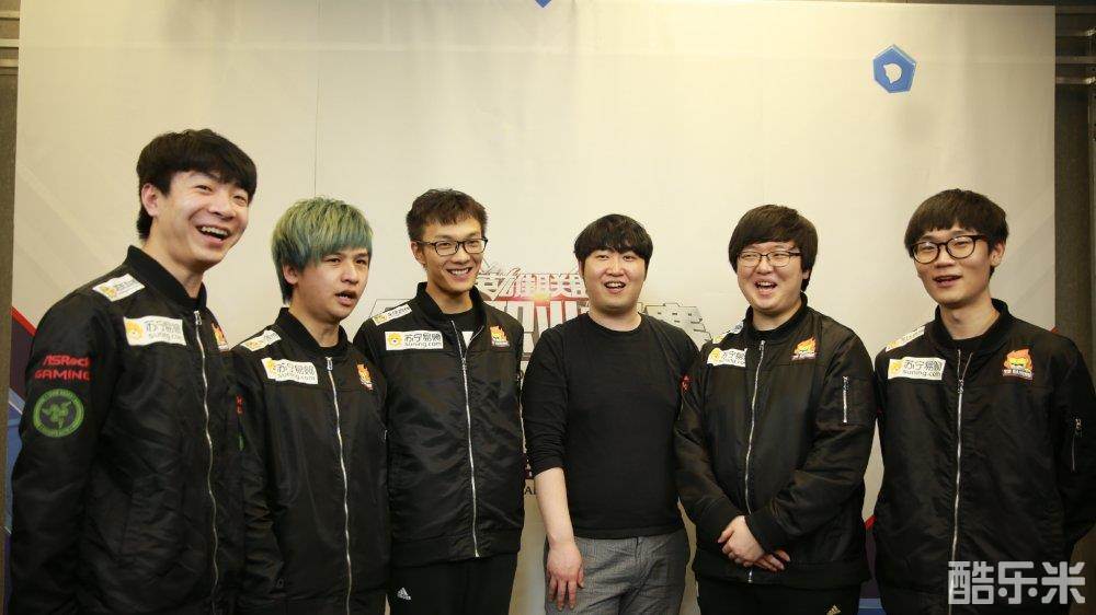 左起:狼行(XiaoAL)、阿伟(Avoidless)、点大哥(Dian)、主教练沈成洙、Fury、Yoon