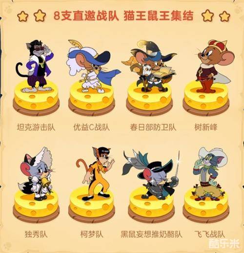 其中坦克游击队是由实力猫皇库啵与坦克老六带领的国榜第二车队强强联手组合而成。队员之间长期配合,战术默契十足,曾获得跨平台精英赛、奶酪杯等多个大型比赛三强。优益C战队则是由包揽无敌猫皇和无敌鼠皇段位成员组成的新晋战队,知名KOL主播猫梦亦在其中,可谓高手集结。春日部防卫队则是由虎牙人气主播、人民艺术家宝鸽鸽带队组成的强队,其他六名队员大多来自全赛季霸占猫鼠榜TOP10的选手,队伍平均年龄21岁。鼠成员有国服第一猫鼠女玩家柯基,温柔帅气的技术小哥哥韶华、冰哥,以及第二届奶酪杯亚军选手CC主播作哑;猫成员由国服两大颜值声优技术型主播王惜凯、拓海坐镇。树新峰(TNB)战队由分包揽S1/S2/S3赛季猫榜第一的虎牙龙煞、斗鱼大西瓜、虎牙无心带队,与国服第一鼠队——最强救人位沐雨、三好、超强意识流溜猫位洛克希、极限翻盘手亦风强强组合。精准的投掷、灵活的走位、独特的策略、沉稳的心态是树新峰接连拿下第一届跨平台精英赛冠军、第二届虎牙嘉年华冠军等大型赛事荣誉的秘诀。同时,树新峰也是春季赛冠军的热门战队。