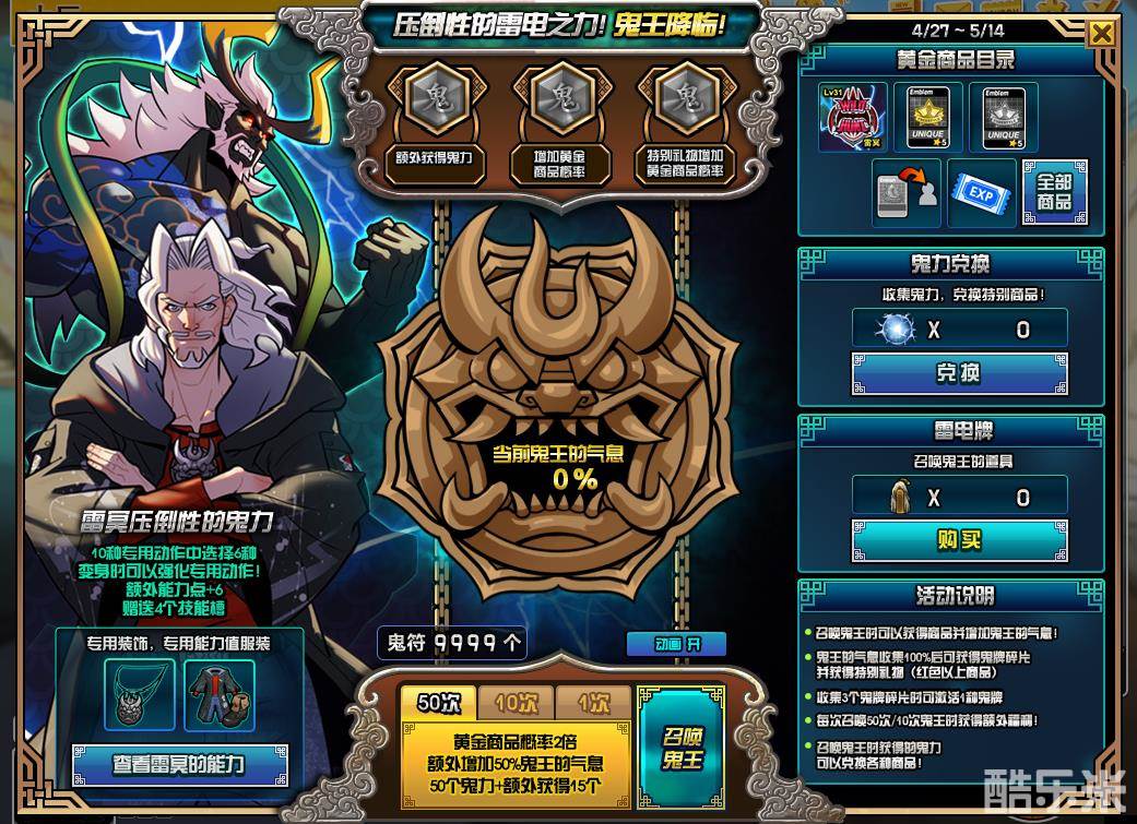 活动期间内创建新稀有角色:鬼王-雷冥,并且等级达到46级以上(包括46级)可以获得道具雷神之锤(永久,+3能力)。道具的能力根据雷冥的职业进行发放: