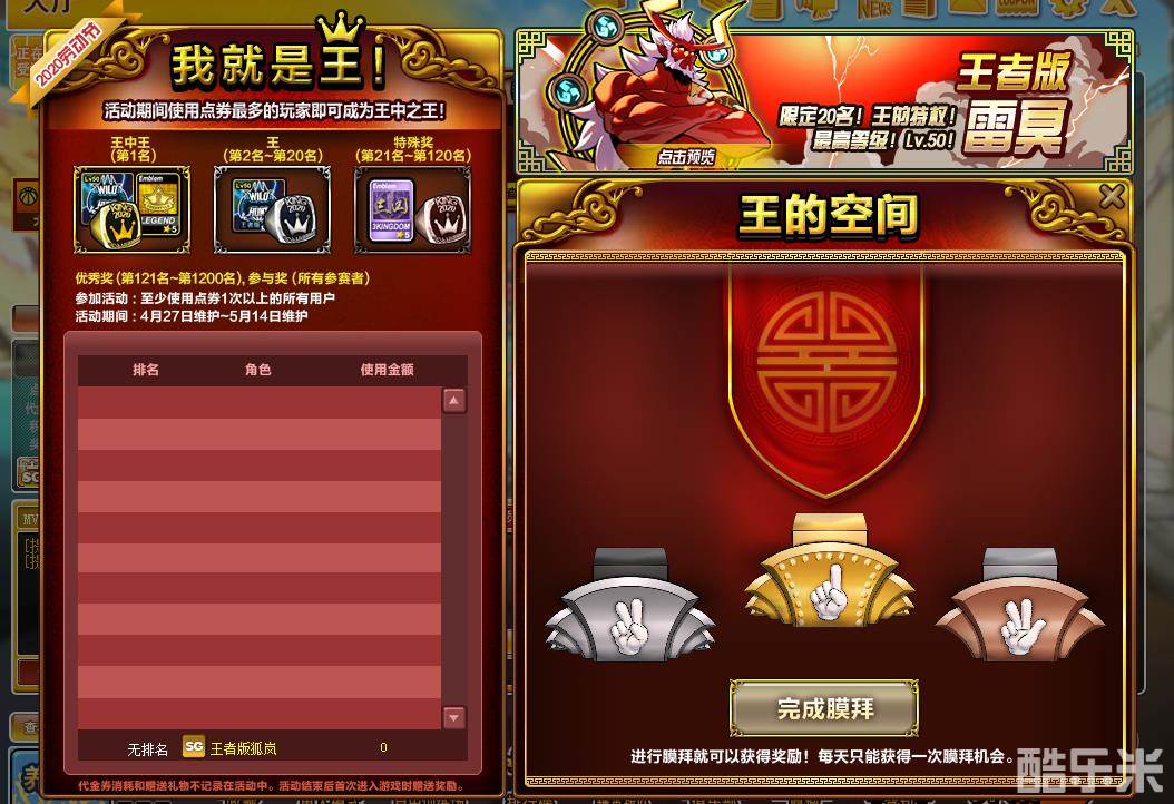 活动期间使用点券最多的玩家成为王中之王!