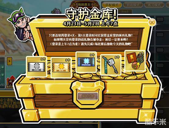 只要连续登录4天,第5天登陆时可以获得金库里的所有礼物。