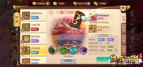 赤甲星魂属性偏向群体伤害、近距离伤害,更有几率致盲和浮空效果,幻化后的的飞靴使装备者5秒内大幅加速,闪现效果下进一步提高暗器爆发力,同时暗器伤害也将大幅提升,配合致盲期间的少量伤害,势必成为竞技PK、近战首选神兵。技能增强外,暗器属性提升效果更为显著,一经激活命中增加35%,暗器识破增加35%。如果说千蛛万毒是适合单挑的暗器,那么幻化后的赤甲星魂就是群战必备。