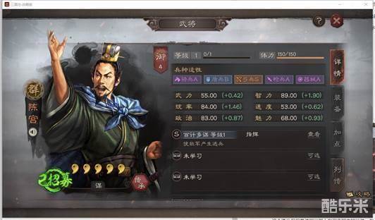 陈宫,S2推出的武将。智力基础89,加成1.90。统御84,加成1.46。统御的基础值排名较为靠前,在目前已知武将中排名47名,统御成长排名为52名,智力基础排名在23名,成长属性排名为34名。作为一名智力型武将,武力值的基础和成长都不高,速度的基础还不错,但是成长属性比较差。