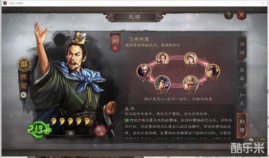 最后编辑于5年前大家好,这里是酷乐米小编龙牧,今天我将会在这里为大家简述该武将的生平、基础数值、战法与兵书解析,为大家推荐合适的阵容搭配并且说明思路,以实战为例详细分析陈宫,让各位对他有全方位的了解,从而更好地使用这名武将!