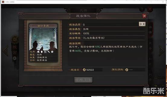 指挥系技能,在每回合在自身行动的时候有70%概率让敌方单体产生逃兵,这个状态受智力加成,而且无视防御,这个无视防御就是真实伤害,不算是谋略或者兵刃伤害。我们看一下具体的技能效果: