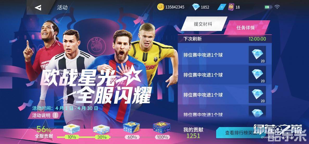 引爆全服的“欧战星光”活动现已开启。“欧战星光”活动将于4月16日正式上线!可以通过完成比赛,达成任务指标,增加个人贡献值与系列奖励。在全服目标达成后,活动还将根据个人贡献值排名来发放奖励。该活动任务难度较低,完成任务即有机会赢取高级球探券、欧战球票、巨星特训卡等大量好礼!