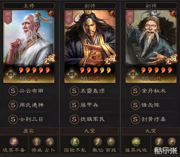 为什么不用最强的司马藤甲?答:于吉满红,司马懿一红;战法配置没啥好说,没上太平做双核输出的主要原因还是想保持硬度,藤甲队的主要功能是消耗,遇火少死点,打其他队低损刷战功,看到司马郝昭曹操队怎么办?躲!平局大师点正的时候1万兵损两万战功,现在满大街的火,该队的操作指南是站二排挑队伍点驻守,具体怎么操作大家都懂,不做具体解释了。