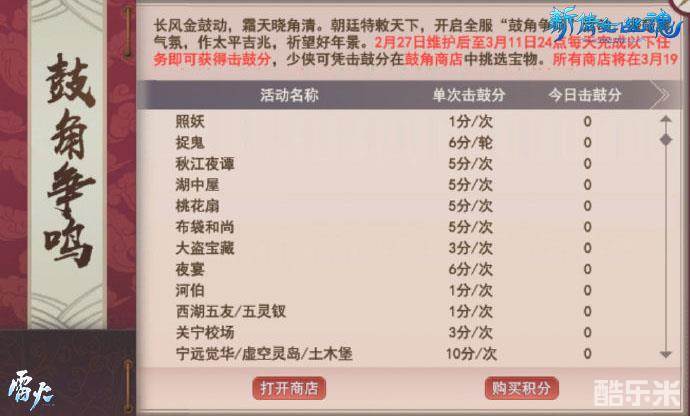 长风金鼓动,霜天晓角清。朝廷特敕天下,开启全服“鼓角争鸣”活动,添鼓舞气氛,作太平吉兆,祈望好年景。截止至3月11日24点,每天完成日常任务即可获得击鼓分,少侠可凭击鼓分在鼓角商店中挑选各式宝物,兑换吴山石鳞礼盒、精美坐骑,时装等好礼。