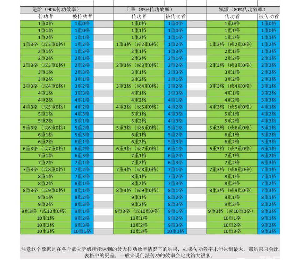 效率存在最大值 不会出现100%传功的情况 当然这里所说的是传功显示效率 一重传一个武功 虽然传过去也是一重 所谓的百分百
