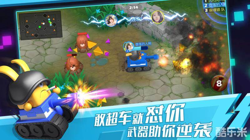 最新的角色造型也是趣味搞怪,例如怒架意大利炮的坦克钢盔兔,手握一管风油精的急救车兔,驾驶拉风摩托的社会兔哥……各种车型丰富多变,游戏中甚至出现共享单车怒怼变形金刚的刺激战况!