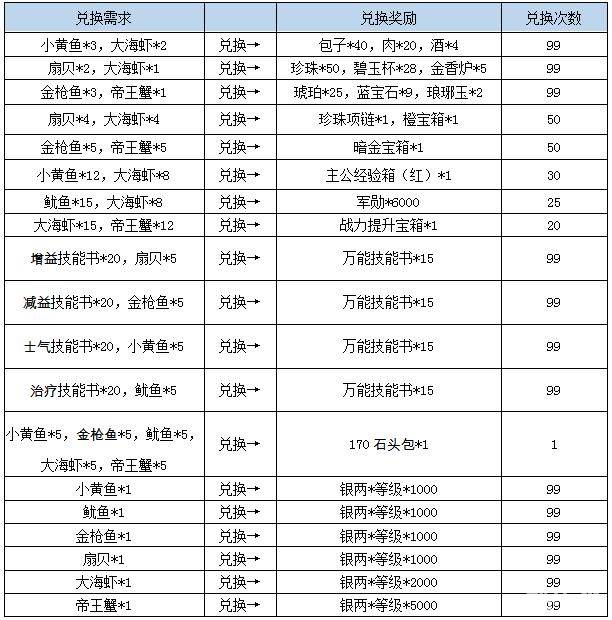 活动内容:活动期间,在游戏主界面上方按钮进入活动界面。活动副本内有不同等级的怪物,根据怪物不同,打败后会掉落对应海鲜材料。海鲜材料可在活动一览中兑换各类资源。
