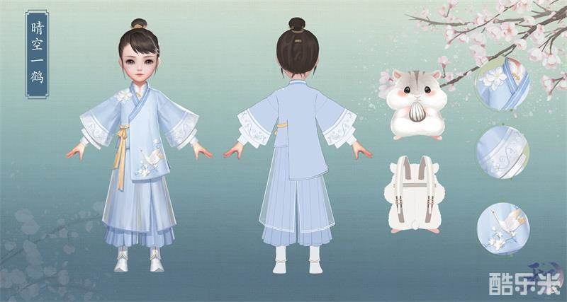 男装款的“金丝化雪”时装,则外披蓝灰色半臂大氅,内穿奶黄色金纹直裰。右肩趴着一只和女装同款的锦毛小鼠,显得儒雅又不失风趣。同样的,男装也自带了一把名为“双啄木”的七弦古琴。到时与女装的琵琶琴曲相和,缠绵情思尽在不言之中,岂非妙哉!