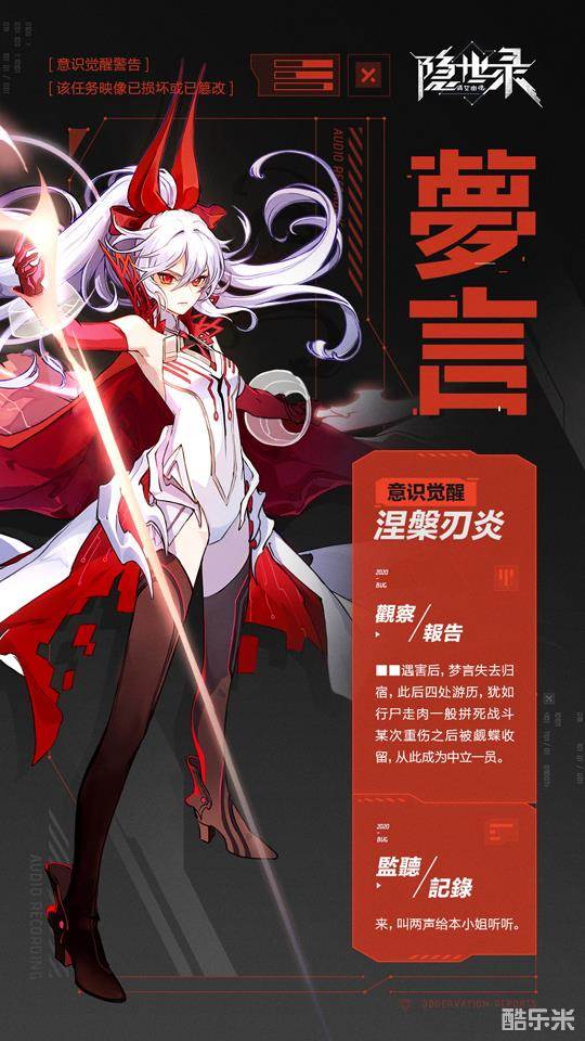 经过调查,梦言终于得知自己身处的世界只是一个虚拟游戏。意识觉醒后的梦言依然是飒爽的红衣刀客,名刃在手,战力又上一层。除了发丝变得雪白,气势变得更加凌厉了些,她的心性并没有太大变化。梦言仍然厌恶那些逃避责任的懦弱者和背地里耍花招的阴暗小人,也依然喜欢聆听弦歌。
