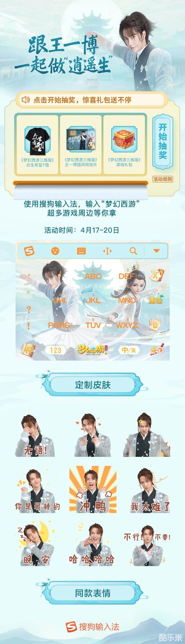 4月17~20日,下载并使用搜狗输入法,在聊天场景下输入“梦幻西游”解锁福利,超多游戏专属周边福利等各位少侠带走!
