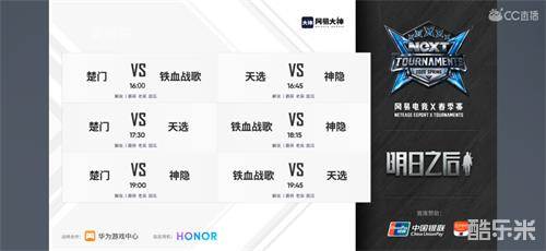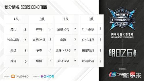 截至今日比赛结束,六场比赛下来【楚门】、【铁血战歌】、【天选】和【神隐】战队分别获得3、7、8和0分的积分数。明天网易电竞NeXT2020春季赛《明日之后》〖幸存者〗明星表演赛仍将继续上演,更多精彩让我们共同期待!