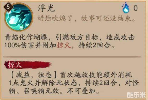 “掠火”是浮世青行灯特有效果,附带“掠火” 状态的敌人使用技能时需额外消耗1火,原本不耗鬼火的技能也会变为1火。“掠火”是状态,可驱散,对怪物和召唤物无效。不吃命中也无法抵抗。