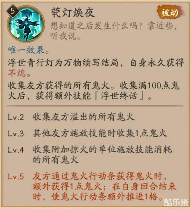 浮世青行灯回合结束时额外推进一格鬼火条,友方通过行动条获得鬼火时额外得到1火。当浮世青行灯收集 到100点鬼火后,将解锁第四技能“浮世终话”。