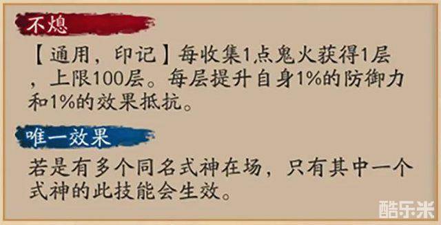 [茕灯焕夜]:被动技能,能收集鬼火获得“不熄” 印记强化浮世青行灯属性,每层强化1%防御与1%抵抗,上限100层,最高强化100%防御与效果抵抗。