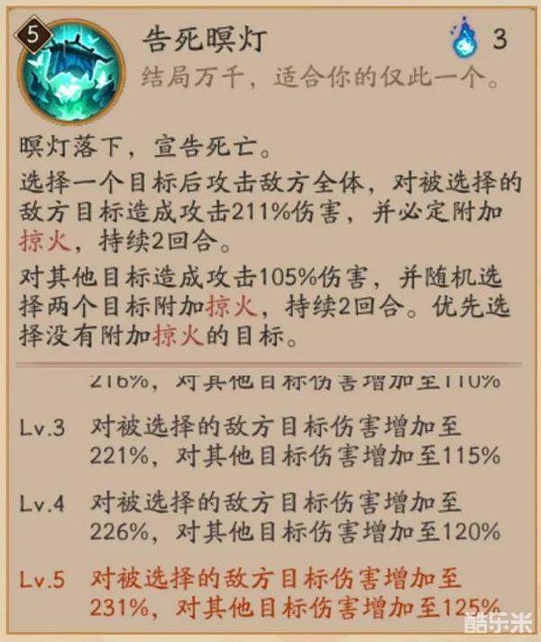 [告死瞑灯]:群攻伤害技能,选定一个敌方单位施放技能,被选中的敌人会承受比其他敌人更高的伤害。技能满级对选中目标造成231%的伤害,对其他目标造成125%的伤害。与普攻一样,大招也能附加“掠火”状态,被大招选中的目标必定附加,然后再给随机两个目标附加。
