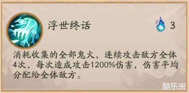 使用浮世青行灯和使用浮世终话基本等同,配合浮世青行灯的阵容都将围绕快速收集鬼火使用浮世终话展幵,而4800%的超强伤害,也对得起“终话”之名。“掠火”状态不能叠加,对已有单位重复施放也只会刷新状态,大招随机附加时会优先给没有的目标。