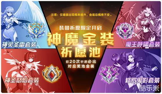 活动内容:新神魔系列金装降临!活动期间内,开启神魔系列装备祈愿池,奖池中神魔金装现概率大幅提升,且奖池前20次抽取必出神魔金装!
