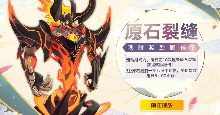 活动内容:活动期间内,每日前10次通关原石裂缝将获得翻倍奖励。(原石黑洞一至八层不翻倍,翻倍次数将于每日5:00刷新)