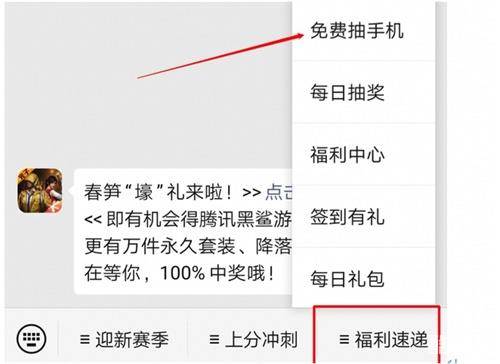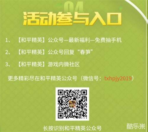 除了活动页面链接之外,特种兵也可以关注《和平精英》游戏公众号(微信号:txhpjy2019),在公众号下方导航栏“最新福利”中选择点击“免费抽手机”进入活动页面。此外,特种兵在公众号直接回复“春笋”或在游戏内的微社区,也可以参与到本次活动!