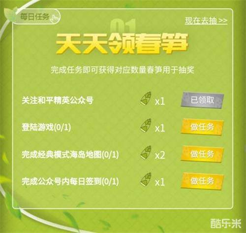 在活动期间,特种兵关注《和平精英》游戏公众号之后可获得1颗“春笋”道具(仅限领取1次);同时,特种兵在关注游戏公众号之后首次进入活动页面同样获得1颗“春笋”道具(仅限领取1次);特种兵也可以通过完成每日任务获得相应的“春笋”奖励。
