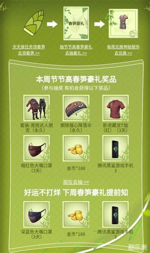 行动不如行动!各位特种兵请赶紧拿起手机,打开微信关注《和平精英》游戏公众号,点击进入活动页面参与抽奖活动吧!最后,祝愿各位特种兵春笋破土,节节高升,欧气爆棚,将黑鲨游戏手机抱回家!