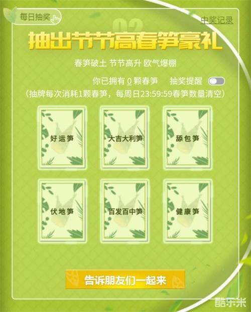 当特种兵拥有“春笋”道具之后,便可以参加抽奖活动。每获得1颗春笋即可获得1次抽卡牌机会。这里需要提醒各位特种兵的是,每周日晚23:59:59“春笋”个数清空,特种兵记得及时去参与抽奖,不要让“春笋”道具白白浪费。特种兵每次抽卡牌有机会获得不同奖励。奖励不仅包括了诸多稀有的高品质服饰套装等虚拟道具,更有腾讯黑鲨游戏手机3实物奖励等你抽取。每周的活动奖励都各不相同,同时也会在奖池下方预告下周的奖励内容。