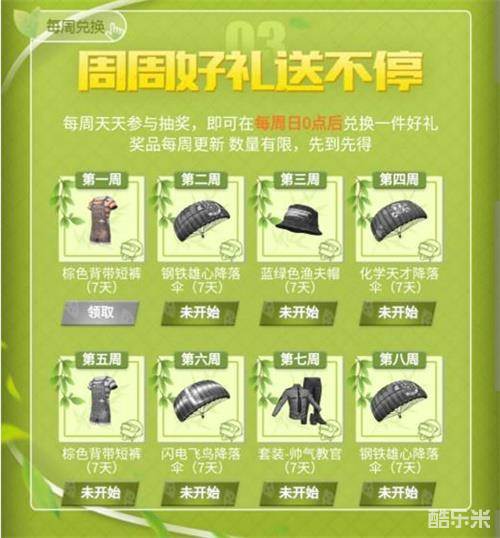 此外,特种兵如果每周天天参与一次抽春笋活动,还可以在每周日零点后兑换一件指定道具好礼,包含有套装、降落伞皮肤和服饰等。兑换好礼每周更换,数量有限,先到先得。特种兵每周内仅限兑换一次,每兑换好礼限领一件。特种兵每周好礼兑换成功,都可以一张炫耀海报,向自己的好友进行分享。
