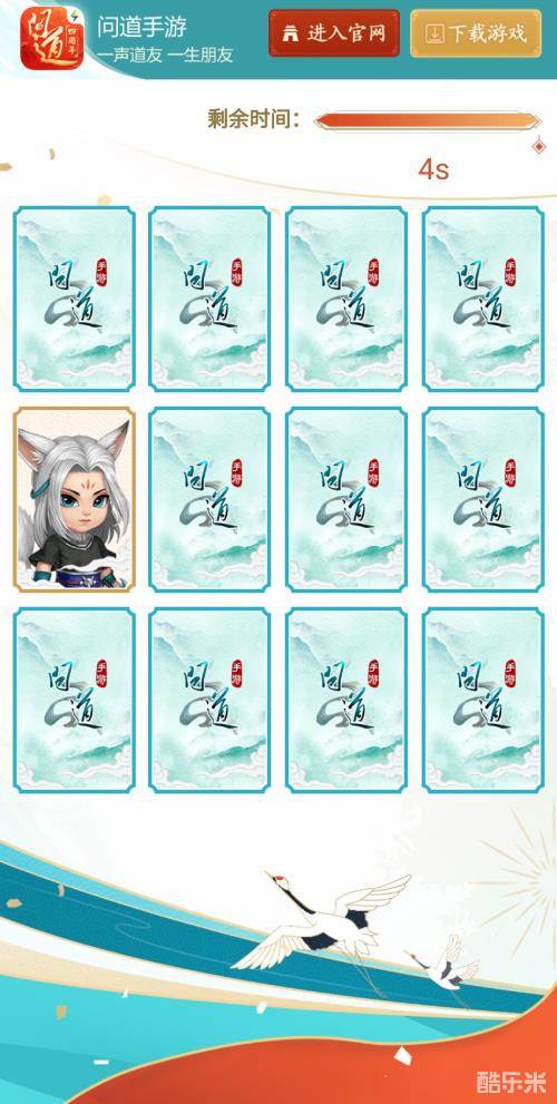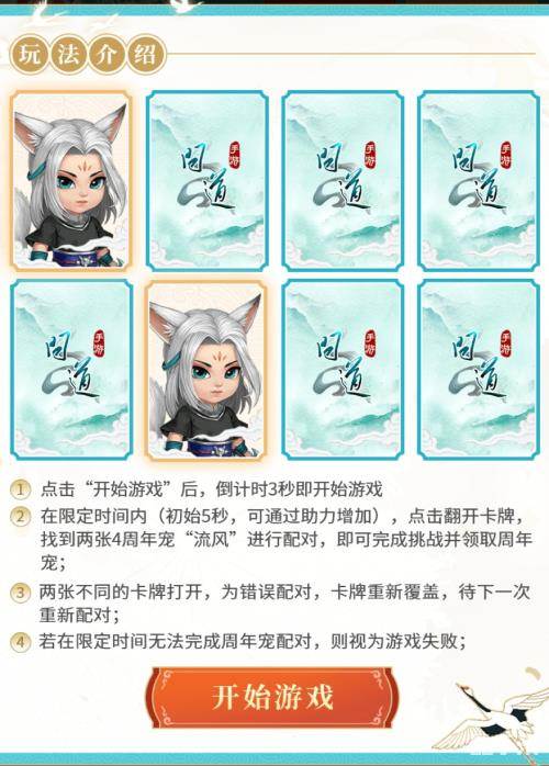 各位道友需要在限定时间内(初始为5s,可通过助力增加),点击卡牌,在12张未知卡牌中找到两张周年宠“流风”,即可完成“缘分对对碰”挑战,若挑战失败可重新挑战。