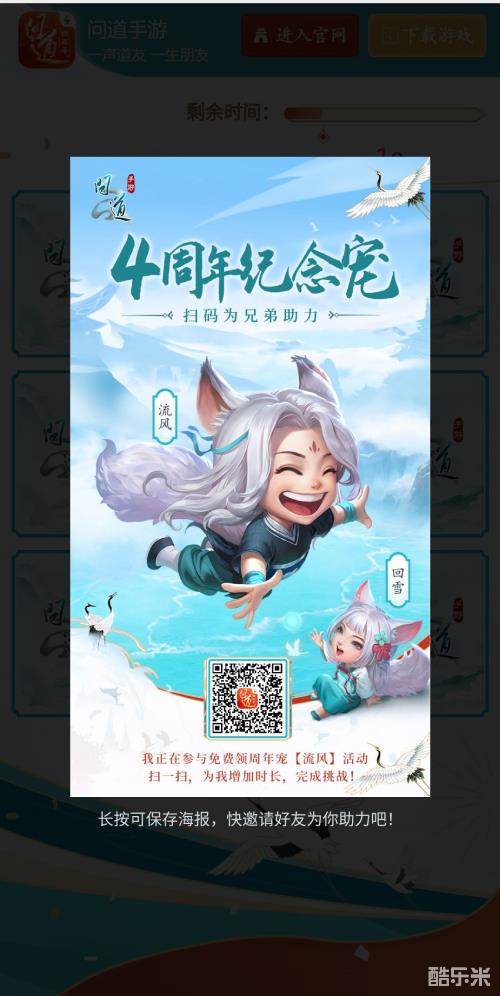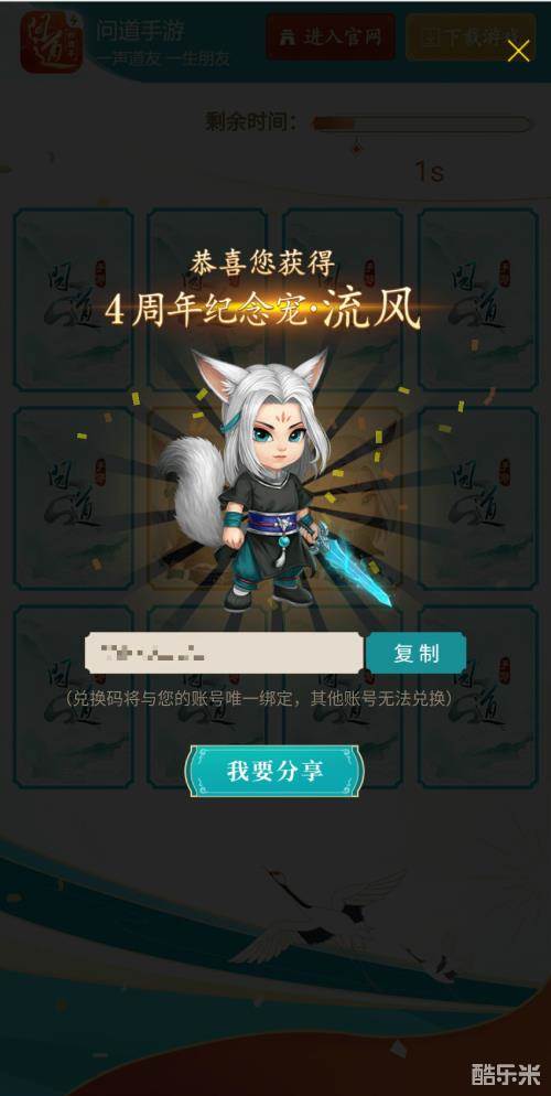 今天免费发放的是4周年纪念宠中的力宠:“流风”,整整6万会以兑换码的形式免费发放给道友,兑换码需要通过完成一个小游戏活动获得。