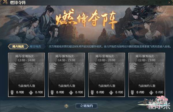 加入阵营之后,每一位阵营成员可以在每周五19:00-24:00,点开游戏中“修行-燃锋夺阵”界面可进行预约,每人只能预约一次。