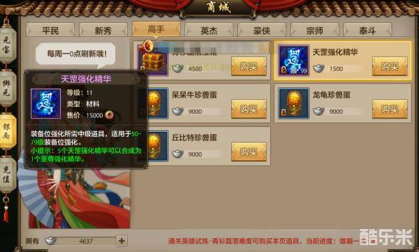 强化装备,是天龙八部手游中,每天提升战力的一个重要玩法,装备位强化,可以增加基础属性,强化等级足够时,还可以激活额外的属性。强化装备需要的强化精华,每周都可以在银两商店中限量购买,需要的银两也是比较多的。
