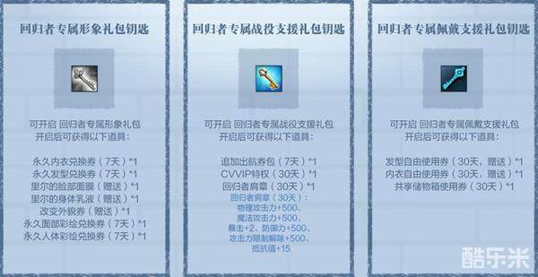 4月21日维护后,30天未登录游戏的英雄在登录后可于邮箱中获得“回归者专属形象/战役支援/佩戴支援礼包”,英雄们可于商城之中兑换对应钥匙开启。