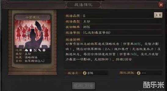 【十面埋伏】:主动战法,对有负面状态的敌军造成谋略伤害,随后对敌军2人施加禁疗和叛逃状态持续2回合。