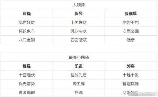 程昱的阵容搭配,主要是两个,一是魏骑,二是杂骑,魏骑就不多说了,大魏骑、小魏骑、五谋臣的搭配网络上到处都有,列个表格把战法发一下就行,就不详细解说了。